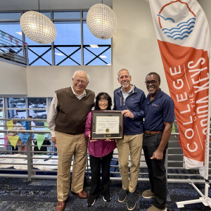 The College of the Florida Keys (CFK) named the Ocean Reef Community Foundation (ORCF) as the inaugural honoree of its new tradition to recognize an individual or organization for outstanding contributions to the College and the broader community. ORCF was selected for its exceptional partnership, dedicated community service, and commitment to expanding educational opportunities in the Florida Keys.. Pictured (left to right): Bill Parfet, Linda Owens, Richard Weinstein, ORCF President & COO, and Dr. Jonathan Gueverra, CFK President & CEO.