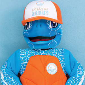 The College of the Florida Keys adopted Shel the Tuga as its official mascot in 2021 following the College’s name change from Florida Keys Community College and rebranding in 2019. Tuga is an abbreviation of “Tortuga,” the Spanish word for turtle. The fictional sea turtle sports CFK’s colors with an Ocean Blue body and a Sunset Orange shell.
